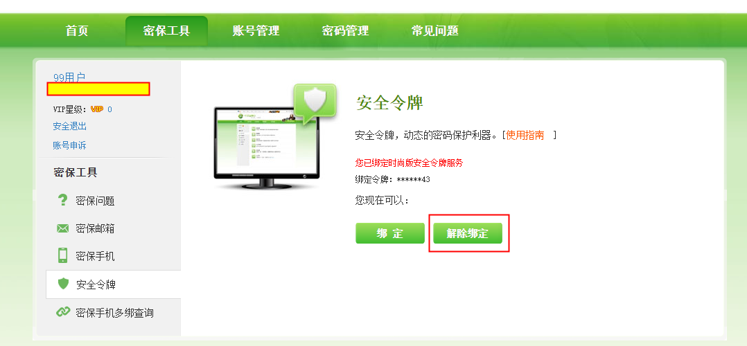 ④点击选择解除绑定,此时您可以通过动态密码或者服务卡(购买时附带的实体卡,刮开涂层有16位的服务卡号)进行解绑操作。