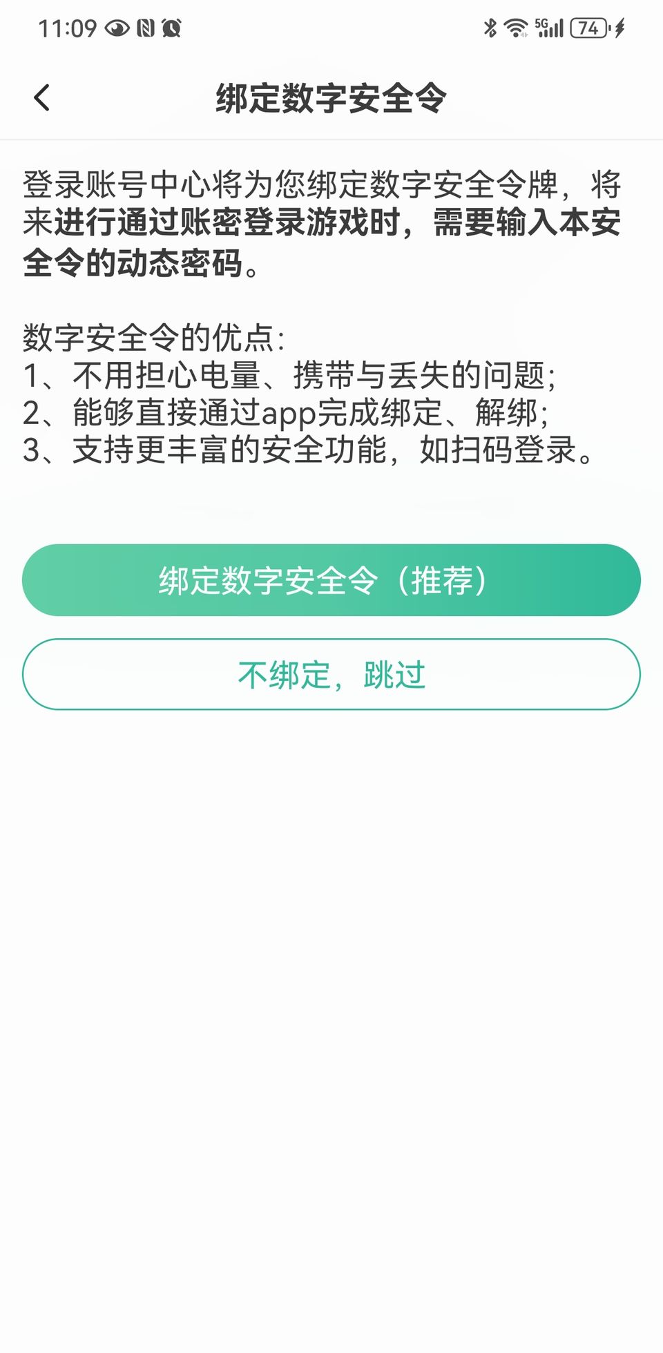 3、验证成功后,跳转“绑定数字安全令”界面,点击【绑定数字安全令(推荐)】按钮,即可绑定成功,生成专属动态密码。