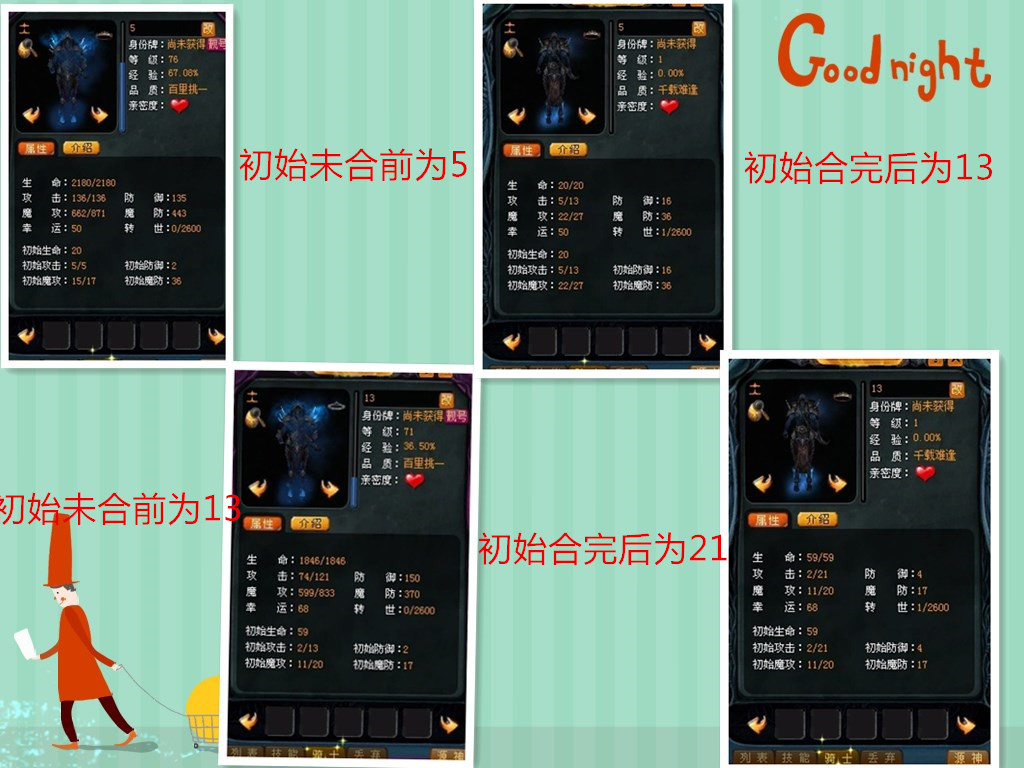 合完之后,原来初始属性为5的吸收掉了初始属性为15的变成了初始属性为13。