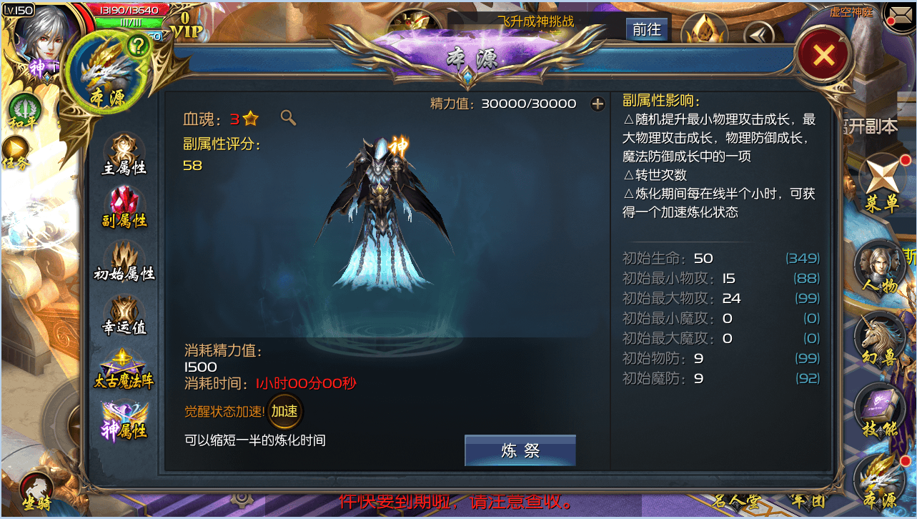 飞升挑战限时30分钟,超时则算作挑战失败,且飞升挑战途中遍布凶险,步步危机,请携带足够的生命恢复类药剂!