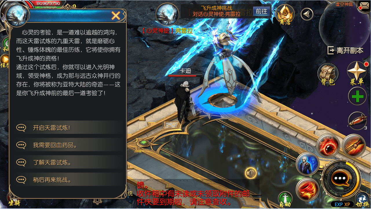 2、穿越雷霆走廊,前往天雷神台,在心灵神使处开启天雷试炼并成功通过该试炼。天雷试炼共分为9个阶段,1-3阶段持续时间均为5秒,4-6阶段持续时间均为8秒,7-9阶段持续时间均为12秒。飞升者须在每个阶段承受持续的天雷伤害,若试炼失败,则须在心灵神使处重新开启试炼。