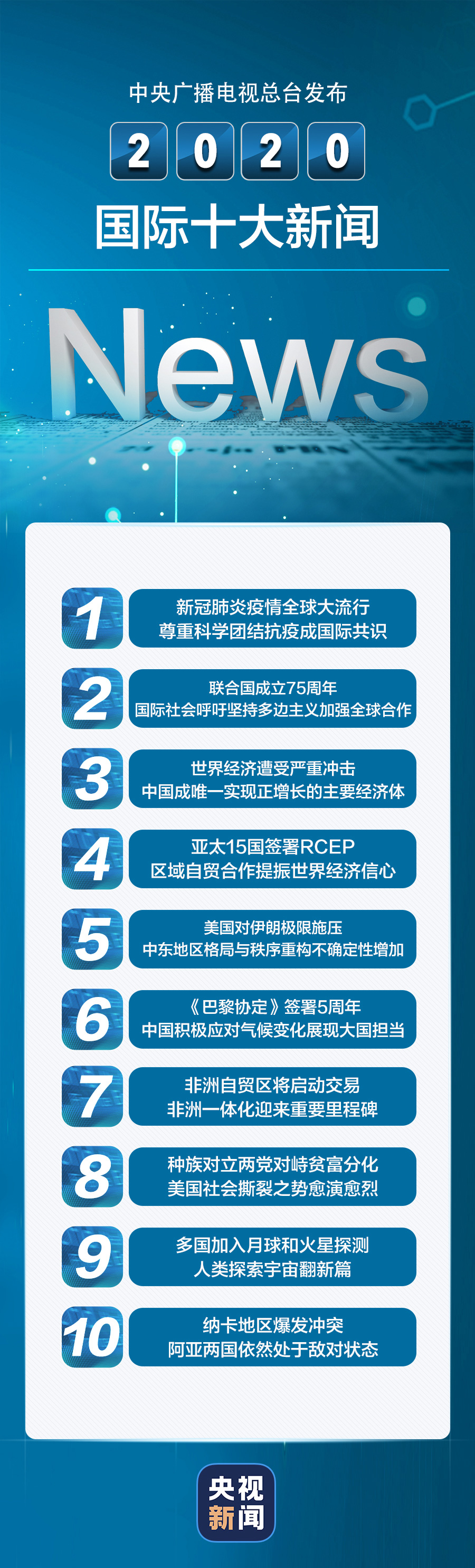 12月28日,中央广播电视总台发布了2020国际十大新闻。