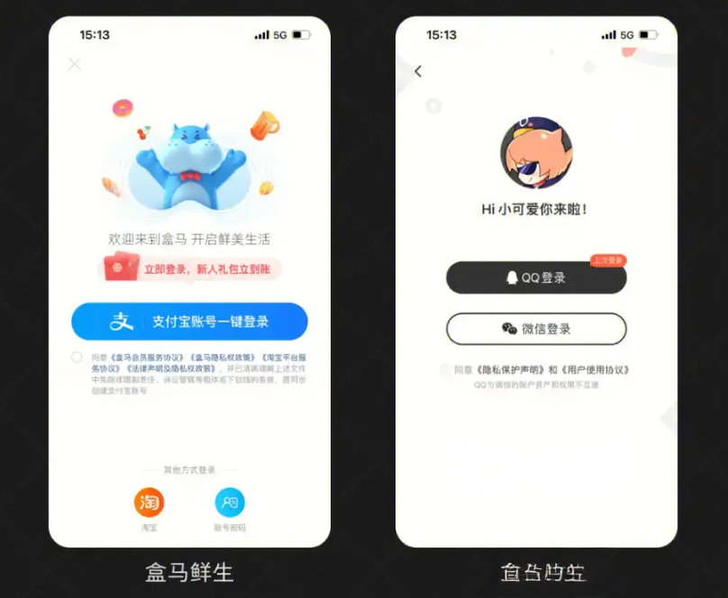 盒马鲜生和腾讯动漫在用户登录流程中,引入第三方的方式即使新用户也不需要对产品进行注册,将大大省略这一流程上所要耗费的步骤和时间。