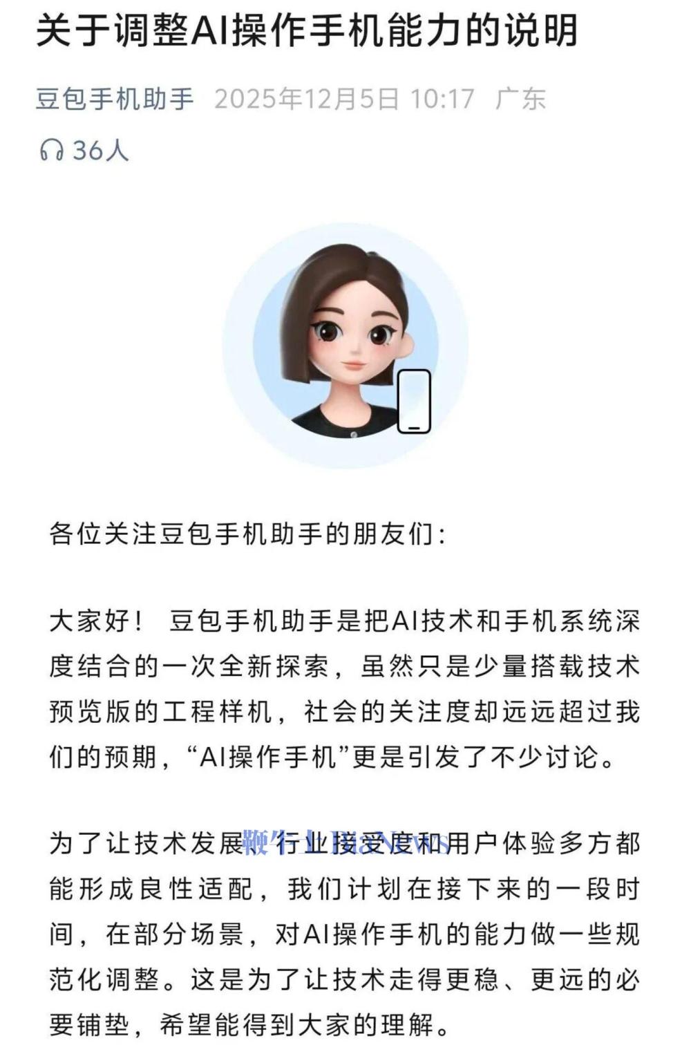 12月5日,“豆包手机助手”发布说明称,将对AI操作手机的能力做了限制,包括限制刷分、金融类应用等。理由是“为了让技术发展、行业接受度和用户体验多方都能形成良性适配”。