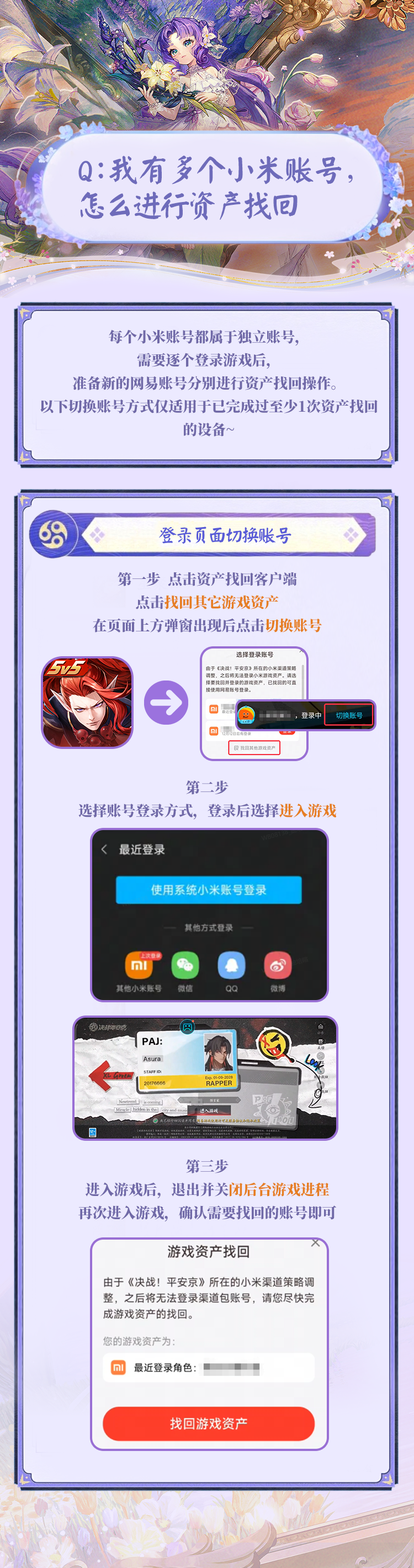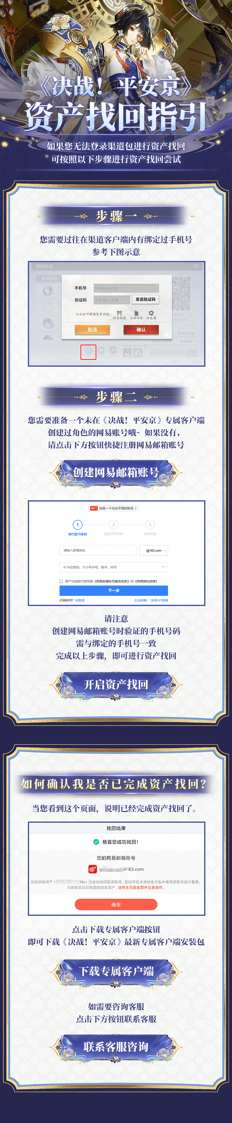 您可以根据操作指引完成角色资产找回,若在操作过程中遇到问题,可查看常见问题Q&A,或者前往网易大神APP,进入客服专区:https://s.163.com/sN1eDL,进行资产找回及获取更多指引信息。