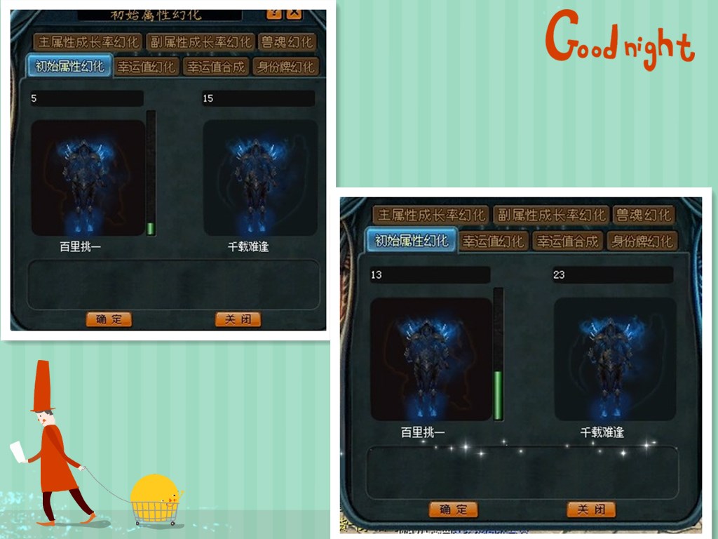 反推过来就是,5初始属性+(15-5)要幻化的2属性之差*0.8吸收率=13幻化后的数,13+(23-13)*0.8=21