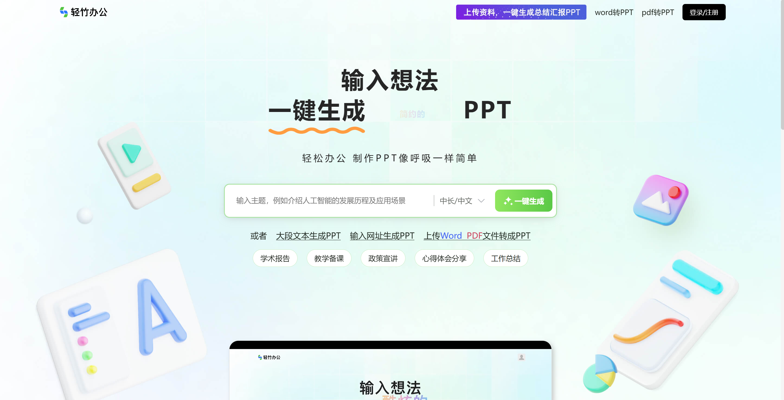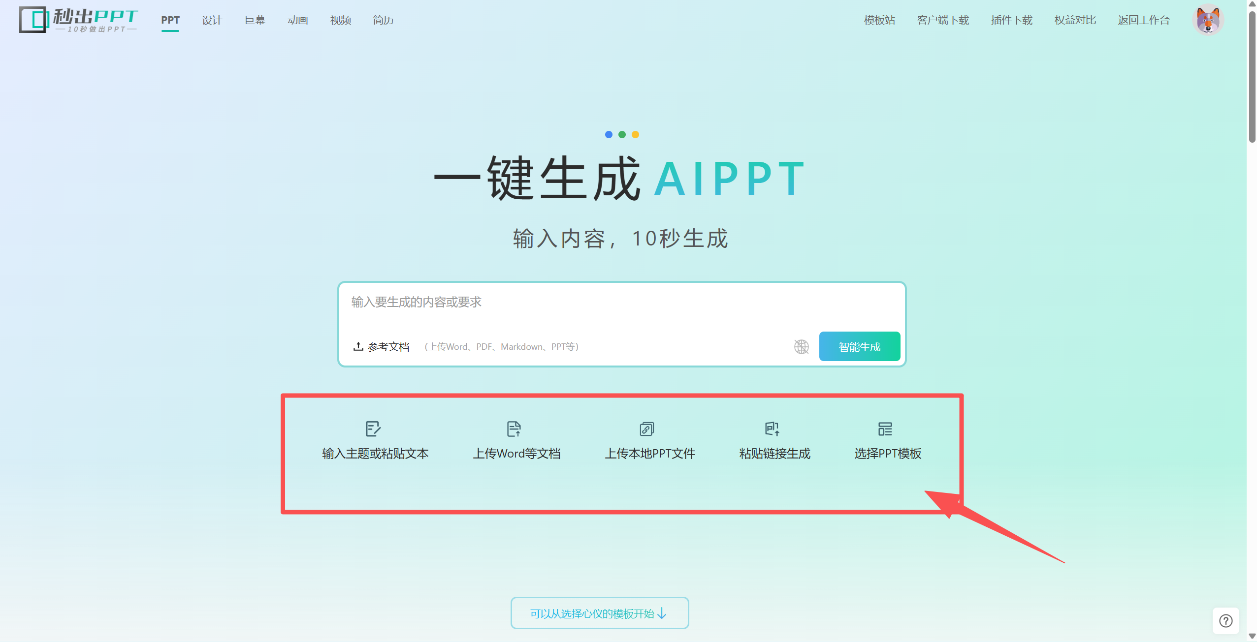 秒出PPT是最开始做ai ppt的网站之一,一直潜心将这一块做到最好。支持用户一键生成PPT,还支持导入文档生成或者是自由输入生成。