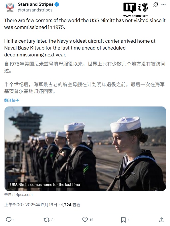 IT之家 12 月 16 日消息,魔域私服外挂001据美国《星条旗报》今日报道,在服役近半个世纪、完成第 30 次部署返航后,“尼米兹”号航空母舰(USS Nimitz)正驶向其职业生涯的最后归途。