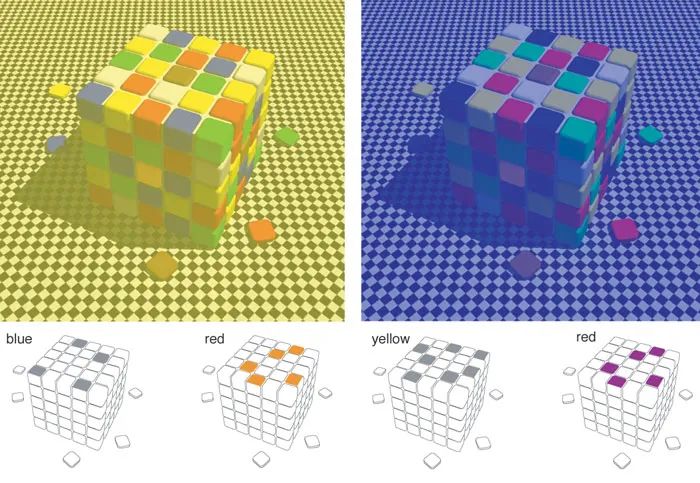 这可以说是一种视错觉,与颜色恒常性(color constancy)有关。颜色恒常性是人类色彩感知系统的一种特性,能让我们在不同光照条件下判断物体的颜色。比如,下图是模拟黄光和蓝光分别照在魔方上的效果,人们很容易从中找出红色方格所在的位置。