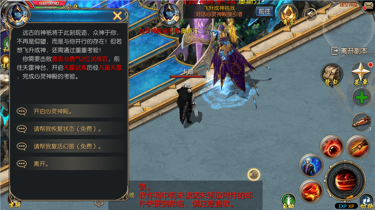 飞升成神第5关——心灵神殿,通过心灵神殿接引者奥斯汀可开启心灵神殿,飞升者须在心灵神殿中完成如下考验:
