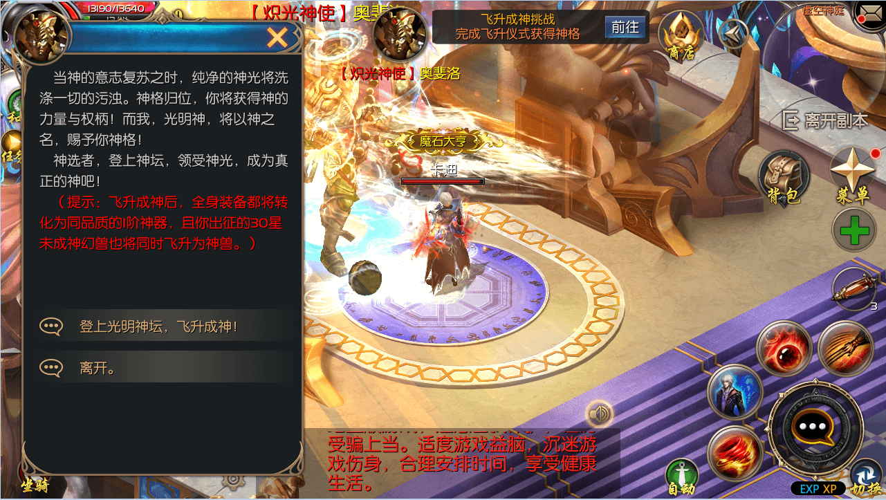 完成所有考验后,飞升者即可通过炽光神使奥斐洛登上光明圣坛,飞升成神!