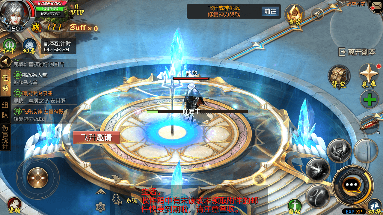 飞升挑战限时30分钟,超时则算作挑战失败,且飞升挑战途中遍布凶险,步步危机,请携带足够的生命恢复类药剂!