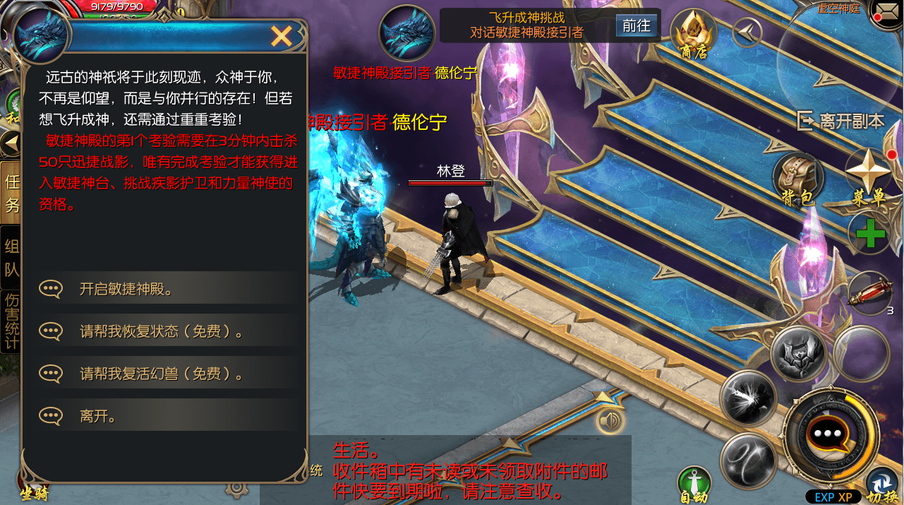 飞升成神第2关——敏捷神殿,通过敏捷神殿接引者德伦宁可开启敏捷神殿,飞升者须在敏捷神殿中完成如下考验: