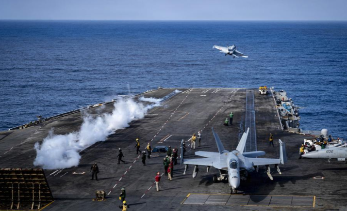 一架F/A-18 E“超级大黄蜂”战机从“尼米兹”号航母上起飞。图源:美媒