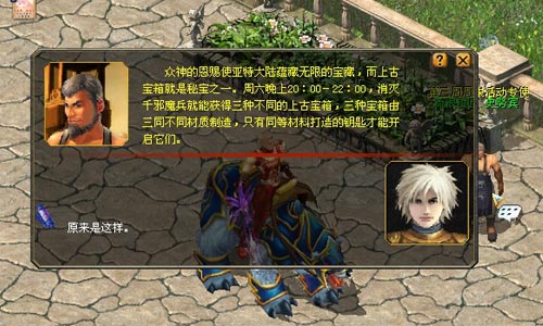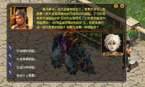 作用:本周末活动专使,介绍活动详情,并帮助打造上古宝箱的钥匙。