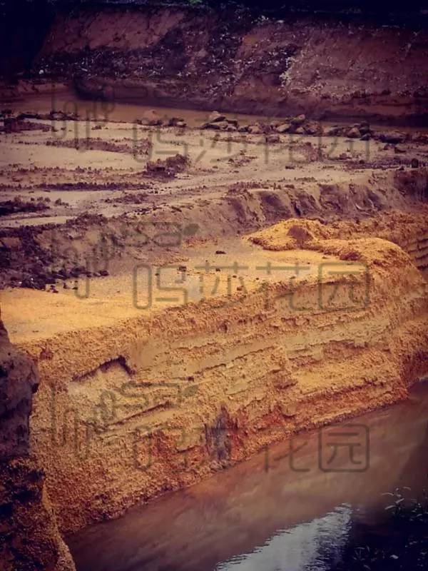 这是矿场的开采现场,大家看到上面红棕色的土层,就是赤玉土。下面黄色的土层,是鹿沼土。
