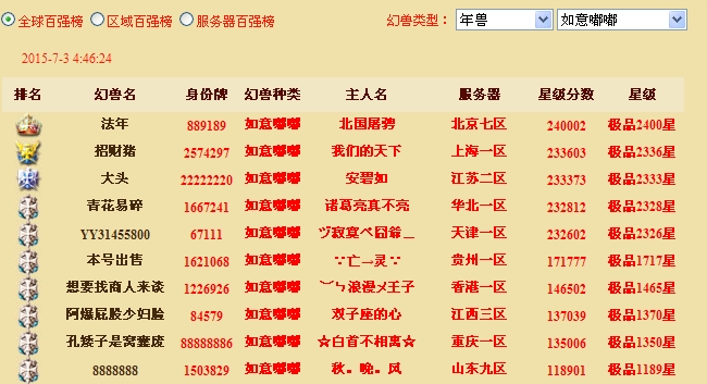 不知道多少大神、玩家以带只年兽为豪,5888MS的身价更是魔域第一高。当然随着后边神兽的出世,副本的兴起,嘟嘟已经不再是我们不可取代的那只宝宝了。但是仍有一大批玩家坚持着对他的执着、不放弃、不抛弃,最终冲得高星,今天先让小记带大惊领略一下世界前十的如意嘟嘟。