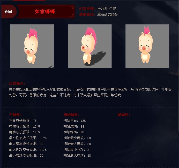 嘟嘟可以说是第一代年兽,在那个宝宝种类不似繁华的年代,嘟嘟的全属性成长以及被后代宝宝作为模版的88/188的初始属性,绝对是魔域的一大亮点。