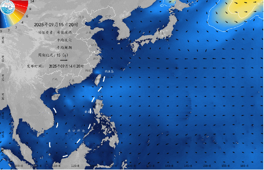 东海、钓鱼岛附近海域有0.8到1.4米的轻浪到中浪;