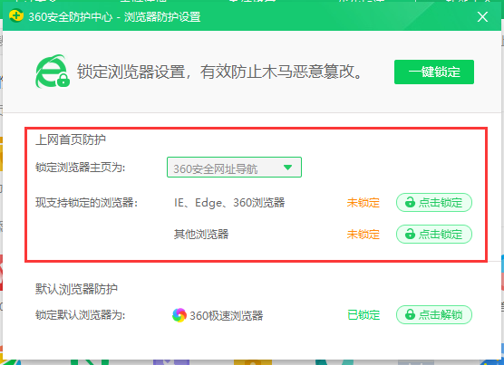 2、在安全卫士--功能大全中找到“主页防护”进行解锁并设置需要的主页: