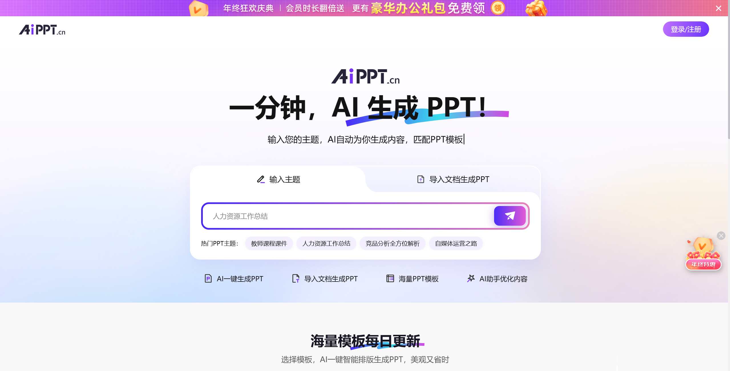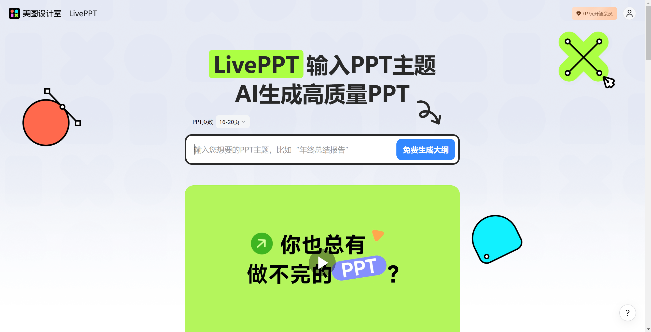 秒出PPT是最开始做ai ppt的网站之一,一直潜心将这一块做到最好。支持用户一键生成PPT,还支持导入文档生成或者是自由输入生成。