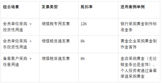“投资性”和“非投资性”。1、投资性用途——需同时满足 “形态达标” 和 “用途合规” 两个条件,具体包括:(1)直接转售:从交易所采购后,不经过加工直接卖给下游;(2)加工为标准投资品:加工成含金量≥99.5% 的金条、金锭(如 100 克金条、1 公斤金锭),且产品需符合交易所的 “投资品标准”(有明确的纯度标识、重量标识,无复杂工艺装饰)。需要注意的是,即使是金条,若含金量低于 99.5%(如 99% 的金条),或添加了复杂工艺(如刻有定制图案的纪念金条),也会被判定为非投资性用途。(3)制作法定货币:生产法定金质货币(适用免征增值税政策的熊猫普制金币除外),适用于经中国人民银行批准生产发行法定金质货币的会员单位。2、非投资性用途——除上述 3 类外,均属于此类,常见场景包括:(1)首饰加工:制作金项链、金戒指、金手镯等饰品,无论含金量高低,均属于非投资性用途;(2)工业使用:用于电子元件(如电路板镀金)、牙科材料(如金合金假牙)、航天材料等工业场景;(3)其他非投资场景:如制作黄金摆件、黄金工艺品,或用于企业抵债、捐赠等。
