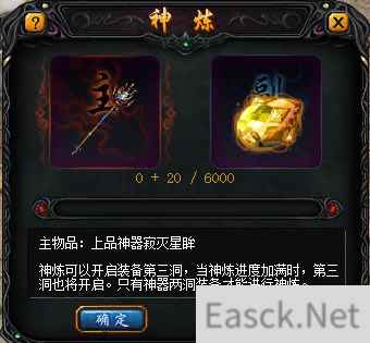 通过使用“神炼之符”,可增加神器的神炼强度,当神炼进度加满时,第三洞也随之开启,需要注意的是,可进行神炼的装备,必须已经开启两个宝石洞,且达到神器品质。