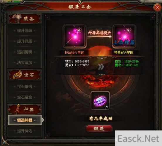 当您的装备到达极品后,还可更进一步,锻造出神器品质的装备,提升神器品质需要“神祈之泪”作为辅助材料,可逐步锻造出:上品神器、精品神器、极品神器。