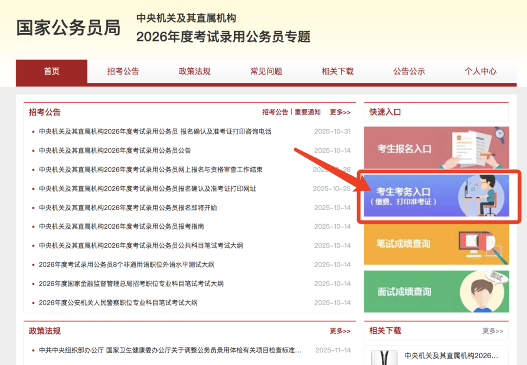 ①登录国家公务员局中央机关及其直属机构2026年度考试录用公务员专题网站。