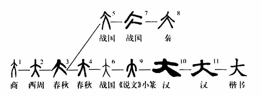 象形字。像正面站立的人形。甲骨文、金文字形是一个两手伸开、两腿分立的正面人形,以后字形一脉相承。本义指大人,读作dà。《说文》:“天大,地大,人亦大,故大象人形。”意为天大、地大,都无从比画作字,故像人形来表示大。如果加笔画特别强调“大”的头顶部位,则成为“天”字。“大”“天”“顶”“颠”原本是一组较近的同源字,而与“首”“頭”(头)则是一组较远的同源字。“大”字引申为大小之“大”,即在年龄、体积、面积、容量、数量、力量、声势、强度、程度、规模等方面超过一般或超过所比较的对象。甲骨文中有“大宗”、“大邑”、“大雨”、“大风”、“大吉”、“大出”、“大御”、“大室”、“大牢”等词语,金文中有“大命”、“大令”、“大政”、“大服”、“大福”、“大宗”、“大神”、“大钟”、“大夫”、“大父”、“大且(祖)”、“大兄”、“大师”、“大叔”、“大牢”、“大子”、“大室”、“大庙”、“大史”、“大保”、“大宰”、“小大猷”、“小大政”、“小大事”、“小大邦”等词语,这些“大”,一般读dà,但传统上也有一些要读tài的,用同“太”,如“太牢”。又读作dài,用于“山大王”、“大夫(医生)”。(郭小武叶青)