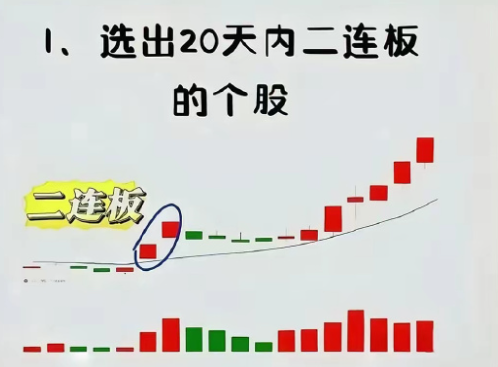 1.在一段行情中,选出20天内有出现二连板的个股。但是这里要注意,不能是一字板。