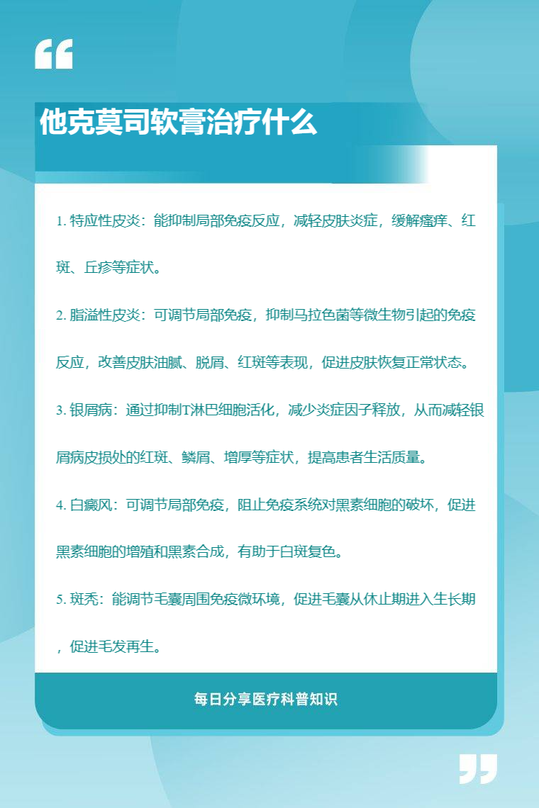 他克莫司软膏可用于治疗特应性皮炎、脂溢性皮炎、银屑病、白癜风、斑秃等。