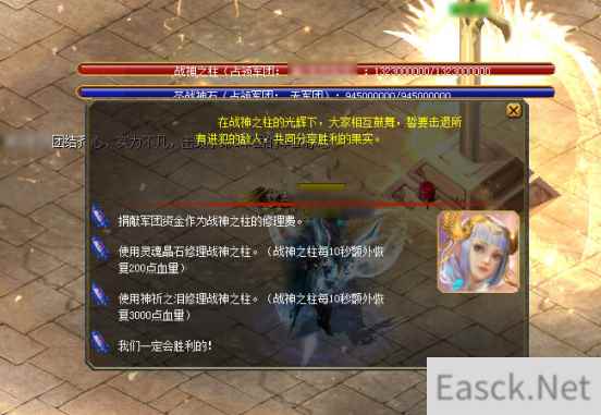 战神之柱可以吸收宝石的力量进行修复,占领战神之柱的军团勇士可通过捐赠灵魂晶石与神祈之泪,使神柱额外恢复更多的血量。
