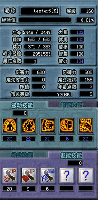 4. 显示角色的伤害力,防御力, 魔法攻击力(限于魔法显示),魔法防御力, PK值, 年龄数值,属性值等.